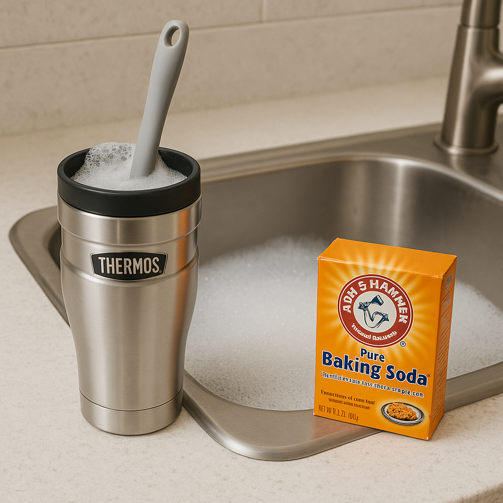 - Mix 1 tablespoon of baking soda with warm water and fill the tumbler.