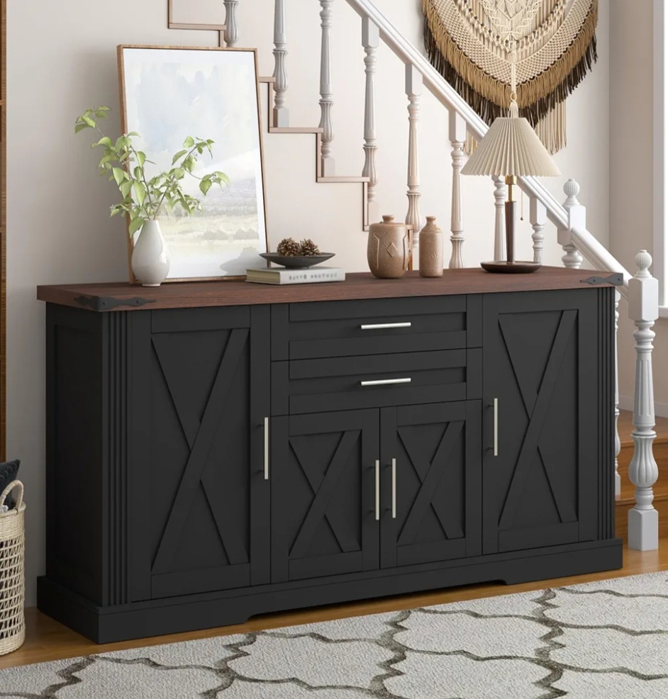 This multifunctional sideboard features adjustable shelves, cabinet doors, and a spacious counter for appliances. Designed to work well as a buffet, console table, or dedicated coffee bar.