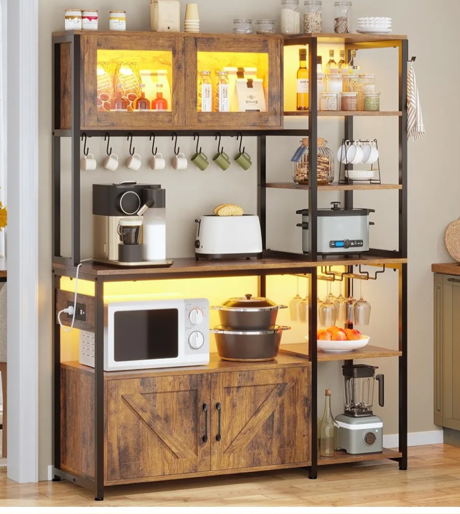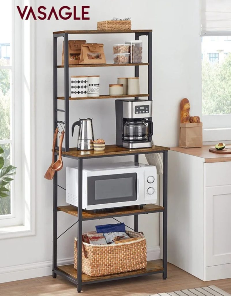 This stylish baker’s rack includes a pull-out wire basket, multiple shelves, and a built-in charging station for convenience. Rustic wood tones meet modern practicality.