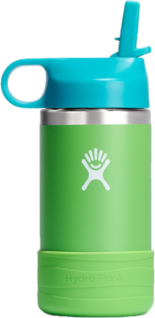 The Hydro Flask Kids Wide Mouth is made from 18/8 pro-grade stainless steel, which resists odors and stains. It comes with a wide-mouth straw lid featuring an easy-access flip mechanism, designed to prevent spills. Thanks to TempShield double-wall vacuum insulation, drinks stay cold for hours. The powder-coated exterior provides a slip-free grip, making it easier for kids to hold, and it is available in multiple fun colors. Its slim profile fits well in small hands and most cup holders. Parents will appreciate that it is dishwasher-safe and easy to take apart for deep cleaning. Approximate price: $20.
